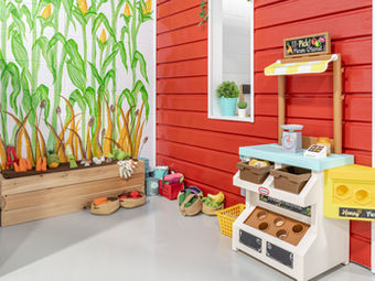 Interactive mini town with roles like firefighters, grocery clerks, and teachers